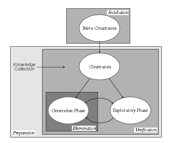 Wallasの分類における準備期では,知識を収集し,仮説生成・検証を繰り返す ことによって新たな解を探求するので,制約に基づいた生成フェーズと探索フェー ズを繰り返す.その際,いかにして有用な知識を収集するかが大きな問題とな る.