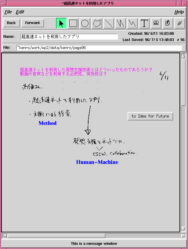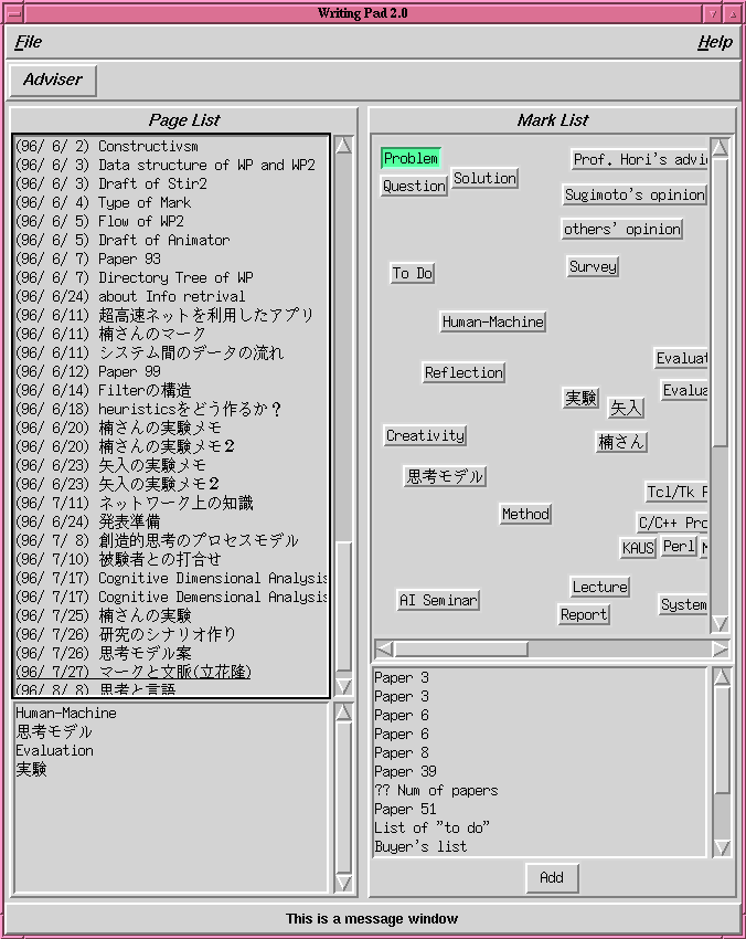 システムは,ユーザとのインタフェースであるWriting Pad 2とオフライン処 理をするMark Daemonから成る.Writing Pad 2は更にMain Window,Page Window,Adviserのモジュールから構成される.Main Windowには,ユーザの入 力したページを時系列に並べたリスト,ユーザがインデックスとして用いるマー クなどが表示される(Fig. 2).Page Window はユーザのノート1ページに相当するウィンドウである( Fig. 3).Adviserはページ間の類似性を距離にしてページのタイトルの アイコンを空間配置して表示する.Mark Daemonはそのページ間の類似性をオフ ラインで計算する.