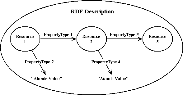 RDF provides a model for describing resources. Resources have properties (attributes or characteristics). RDF defines a resource as any object that is uniquely identifiable by an Uniform Resource Identifier (URI) [URI1][URI2]. The properties associated with resources are identified by property-types, and property-types have corresponding values. Property-types express the relationships of values associated with resources. In RDF, values may be atomic in nature (text strings, numbers, etc.) or other resources, which in turn may have their own properties. A collection of these properties that refers to the same resource is called a description. At the core of RDF is a syntax-independent model for representing resources and their corresponding descriptions [SPEC]. The following graphic illustrates a generic RDF description.