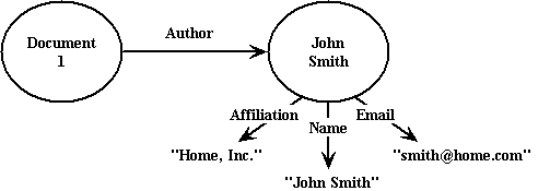 If additional descriptive information regarding the author were desired, e.g., the author's email address and affiliation, an elaboration on the previous example would be required. In this case, descriptive information about John Smith is desired. As was discussed in the first example, before descriptive properties can be expressed about the person John Smith, there needs to be a unique identifiable resource representing him. Given the notation in the previous example, the data model corresponding to this description is expressed as: