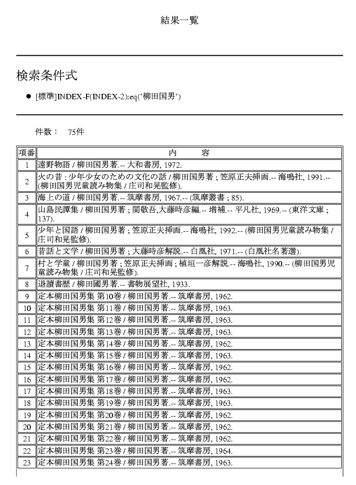 一例を挙げれば「国」と「國」がそうである。この両字は相互に同じ字であると解釈され、通常どちらで書かれていても区別されることはない。しかし、文字コード上では両字には別々のコードポイントが与えられており、処理上は別字として扱われている。このことがもたらす最も典型的な問題を、本学のULIS OPACに見出すことができる[図1,2]。検索キーとして「柳田國男」を与えた場合と「柳田国男」を与えた場合では、得られる検索結果が全く違う。利用者側の立場からすると、「柳田國男」でも「柳田国男」でも同じ結果が返って来るように、「国」と「國」は同一視して欲しい。しかし文字コード上からだけでは、これらの異形字を同一視するための情報を得ることは不可能である。これらの同一視のためには、異形字情報を別途用意する必要がある。