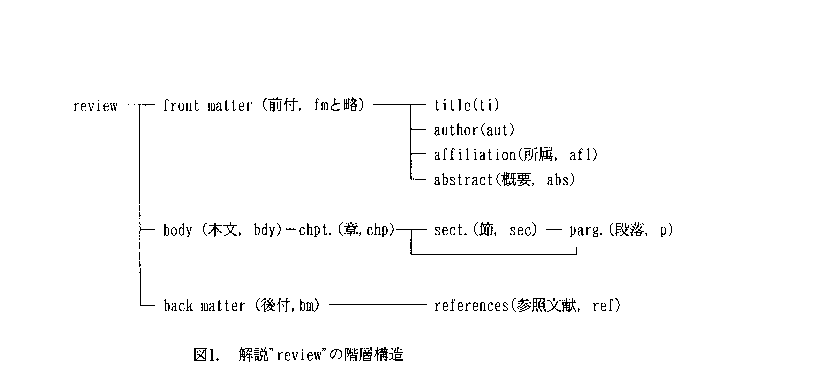 ここで「ディジタル図書館における基本出版技法:SGML」というタイトルの解 説(仮にreviewと名付ける)があるとして、これを例にしてDTDとテキスト・デー タを説明する。この解説が収録されている逐次刊行物「ディジタル図書館」の印 刷様式から推定して、文書は図1に示す 階層構造を持つとする。すなわち、review はfront matter(前付, fmと略), body(本文, bdy), back matter(後付, bm)という3つの要素(element)が、こ の順で並んでいるとする。また、fmは要素:title,author, affiliation, abstractの順で構成される。bdy は章で、章は節で、節は段落で構成される。 あるいは直接段落となってもよい。等々とする。