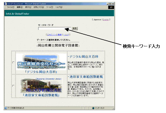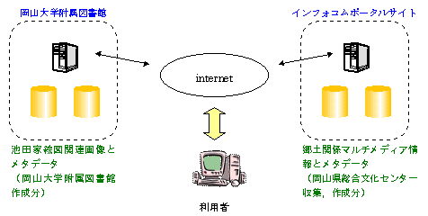 岡山県総合文化センター(岡山県立図書館)では,県内各図書館,機関で蓄積してきた郷土関係マルチメディア情報(資料,記事の本文,画像,音声,動画,ホームページ等)を各サーバにデータベース蓄積し,横断検索できる仕組みの構築に取り組んでいる。併せて,インターネットを通じて,県民もデータ提供できる県民参加型システムについても構想している。技術的基盤にZ39.50,Dublin