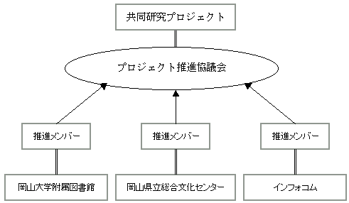 今回の構想は,技術基盤に39.50とDublin Coreを採用し,インターネット,情報提供に岡山情報ハイウェイ,インターネット等が介在するという点で,物理的なネットワークの存在に目が奪われがちである。しかしながら物理基盤の整備が落ち着く今後は,それらを活用して付加価値を生む側面に目を移し,継続的なコンテンツ作成の仕組み,効果的な情報提供の仕組みをいかに構築していくかを新しい課題とする必要がある。その解決のためには,組織や個人の有機的連携,人的ネットワーク,組織化は欠かせず,情報共有,学習,知識創造というプロセス重視の姿勢が重要である。有機的連携,人的ネットワーク,組織化は本構想のかぎであり,今後もさまざまな継続的努力が欠かせない。