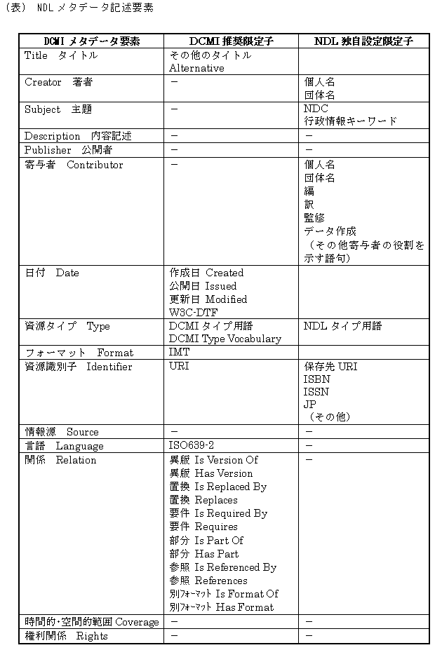 た「NDLメタデータ記述要素」を取り決めた。計画の前提となるNDLの電子出版物への