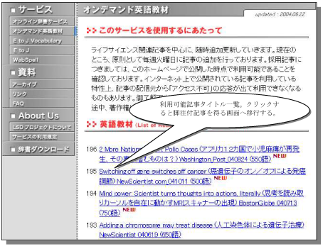 (図5:LSD Reading Assistant Project ホームページ。利用可能記事タイトル一覧)