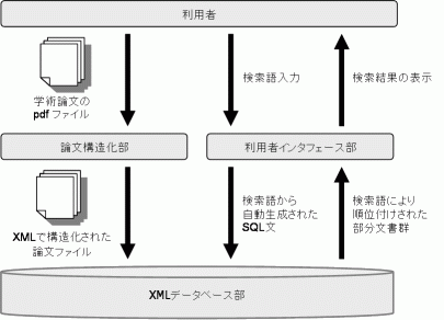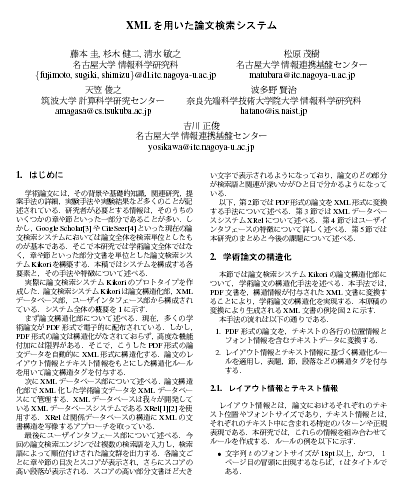 以下, 第2節ではPDF形式の論文をXML形式に変換する手法について述べる. 第3節ではXMLデータベースシステムXRelについて述べる. 第4節では利用者インタフェースの特徴について詳しく述べる. 第5節では本研究のまとめと今後の課題について述べる.