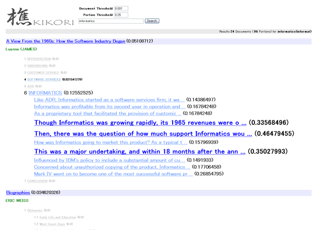 最後に利用者インタフェース部について述べる. 今回の論文検索エンジンでは複数の検索語を入力し, 検索語によって順位付けされた論文群を出力する. 各論文ごとに章や節の目次とスコアが表示され, さらにスコアの高い段落が表示される. スコアの高い部分文書ほど大きい文字で表示されるようになっており, 論文のどの部分が検索語と関連が深いかが ひと目で分かるようになっている.