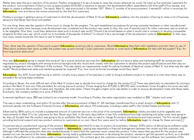 論文や各部分文書のタイトルはアンカーとなっている. 各アンカーをクリックすると論文全体が表示される. 部分文書のアンカーをクリックした場合, 部分文書全体をハイライトして表示するようにしており, 部分文書の前後の流れを見ながら 該当する部分文書を読むことができるようになっている. 論文中に存在する検索語とマッチする語をハイライトして表示しており, 検索語と関連の高い部分をわかりやすくしている. 論文の表示例を図7に示す.
