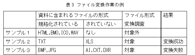 本調査では、(1)・(4)に該当する電子資料39点のうち、ISOによって規格化されているものなど、ソフトウェアベンダーに依存しない形式のファイルのみによって構成されている資料が24点あった。これらは長期的に利用保証することが比較的容易であると考え、残りの15点について、市販のファイル形式変換ソフトウェアを用い、より規格化された形式に変換することを試みた。変換作業の例を表3に示す。