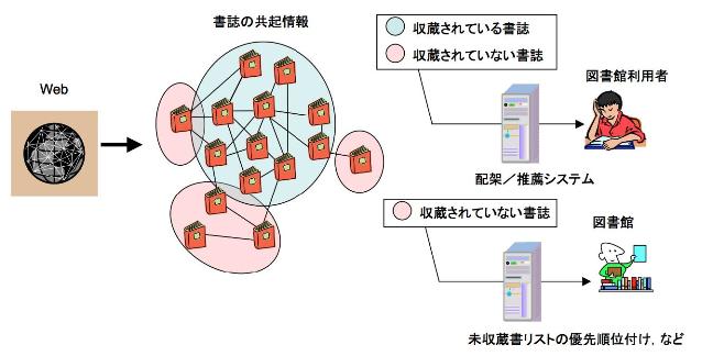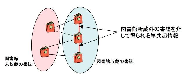 近年,Web上には個人の読書履歴など,書誌に関する情報が掲載されている.そこで,このようなWeb文書中の書誌情報を同定し,同文書中に含まれる書誌情報を,書誌の粗い共起情報と捉え,貸出履歴を補完するものとして収集する.配架システムは,貸し出し履歴が少ない書誌についてはこのような情報を拠り所とし,貸出履歴の蓄積が進むに従い,後者の情報を重用する.つまり,書誌の貸出履歴の蓄積量が進むにつれて,配架の計算から緩やかにWeb上の情報を排除すればよい.また,Web上からは図書館に収蔵されている書誌とそれ以外の書誌,さらには収蔵されていない書誌同士の共起情報を得られ,配架システム以外への応用も期待される(図1).この収蔵されていない書誌を介した推移的な共起情報(図2)は,後述するWeb上での調査では収蔵されている書誌の9割程度を占めるため,非常に重要な役割を果たすものと考えられる.