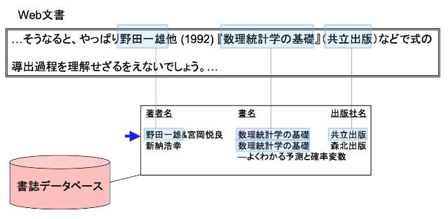 例えば,「書名:統計科学のフロンティア10言語と心理の統計−ことばと行動の確率モデルによる分析,著者名:岩波書店」を考えてみる.Web文書中で書誌情報を書く際,書名におけるシリーズ名「統計科学〜10」や副題「−ことばと〜分析」は省略されることも多い.また著者名については,書名・出版社名に比べると複雑な構造をしており,「著」や「編」,「translated by」といった責任表示が加わり [4],筆頭著者のみを示す場合(「甘利俊一他」)や苗字のみを列挙する場合(「甘利,金,村上,永田,大津,山西」)などさまざまである.出版社名については,「書店」や「出版」で終わる場合,「岩波」のように略記される場合がある.