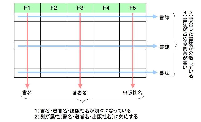 (1)書名・著者名・出版社名に対応する列がそれぞれ独立に存在する.