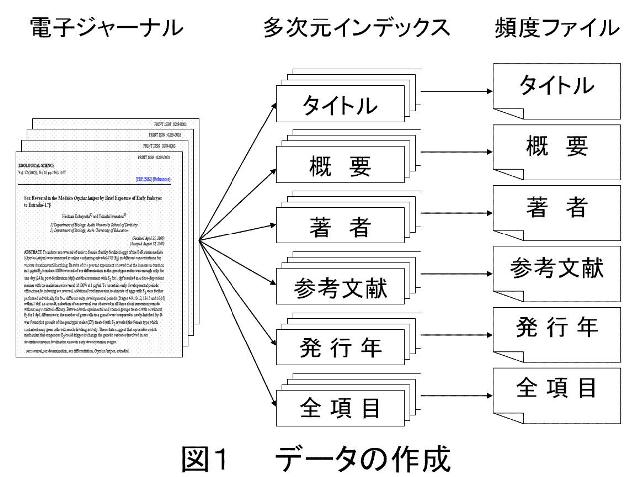 データは多次元インデックス法により作成される.今回扱う Zoological Science の場合 ,各論文からなるファイル集合を用意し,それらのデータについて作成したいインデック スの項目ごとに切り分ける.各論文はすべて同じ構造を持っているが,今回はタイトル, 概要,著者,参考文献,発行年,全項目などの複数項目からなる多次元インデックスを作 成する.そしてクラスタリング計算が行えるように,項目ごとに各文書に各単語が何回出 現するか記した頻度ファイルを作成する(図1).