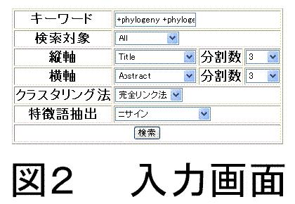 本システムは次のように利用される.ユーザは検索要求を入力し,検索対象項目そして得 られた検索結果をクラスタリングする2つの項目とそれぞれの分割数を選択する(図2). そして,これらの情報を送信するとマトリックスが生成される(図3).