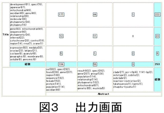 一方,分割数増加による細粒化やズーミングを繰り返すよりは,検索式を洗練した方が効 率がよい場合もある.特に,大きめの頑強なクラスタがある場合にはその方がよい.検索 式の洗練にあたっては排除すべき特徴語を発見するのは一つの手段であるが,実は先述の 分割数変更とズーミングを併用するとこのような語を比較的容易に発見できる.例えば, 先述の expression などは生物多様性に注目するならば排除してよい単語だと推測される が,事前に思い付く特徴語ではなく,マトリックスで示されてはじめて「なるほど」と思 う類の語である.実際,系統と遺伝子発現の組合せはたとえば「○○という生物は系統上 ユニークな位置を占めており,その形態形成メカニズムを知ることは重要である.そこで ,本研究では○○の形態形成で発現している遺伝子について調べた」といった内容の概要 にしばしば現れていた.こうした弱い関係にある特徴語をクラスタリングによってあぶり 出せる本手法は,必ずしも自明ではない隠された特徴語を示唆する有効な手法であると考 えられる.