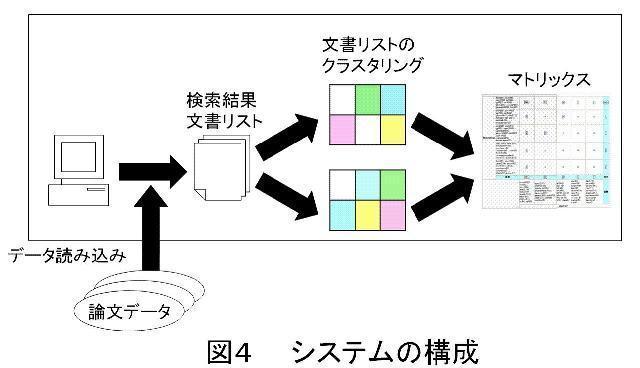 マトリックス生成の際,内部では以下の処理を行っている(図4).まず,検索要求からユ ーザが選択した項目で検索し,検索結果である文書リストを得る.次に,この文書リスト を,ユーザが選択した2つの項目でそれぞれ指定した数にクラスタリングし,あわせて特 徴語を抽出する.なお,本システムでは完全リンク法,単一リンク法,群平均法,重心法 の4つのクラスタリング計算方式から選択し,特徴語はイエーツの補正公式,カイ2乗値 ,コサイン,ダイス係数,自己相互情報量,対数尤度比,頻度,補完類似度の8つの抽出 方式 [7] から選択した方式に基づいて抽出された10語を表示する.ある文書のクラスタ リング結果がそれぞれクラスタi,jに属するとき,その文書はマトリックスのi行j列セル の要素となる.これを検索された文書リストすべてに対して行うと,セル内にそのセルに 含まれる文書リストならびに文書数を記した2つのマトリックスが出力される.そして所 望のセルをクリックすると,そのセルに含まれる文書リストについて同じ条件でマトリッ クスを生成するズーミングを行う.