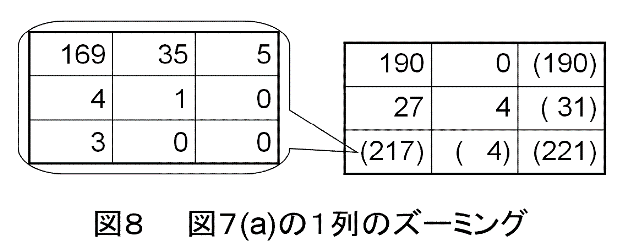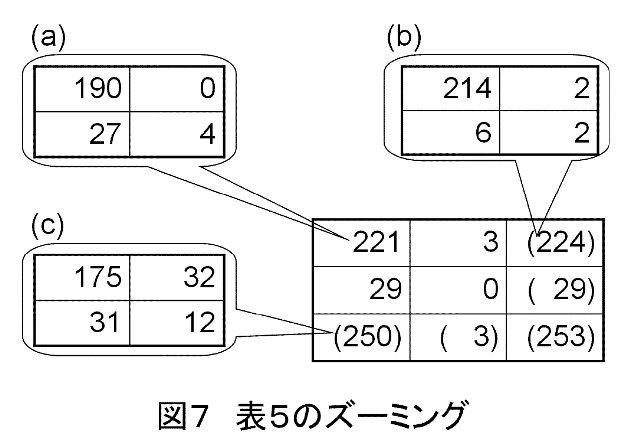 一般的に本手法でのズーミングは,ユーザが興味の対象を選んでクリックするだけであり ,その解釈はユーザ自身が直観的に行うことになる.ズーミングは一つのセル,一つの行 または一つの列のいずれに対しても可能であり,どれが良いかは状況に依存する.ズーミ ングにおける分割数は以前の値を引き継ぐので,たとえば表5をズーミングする場合は得 られる結果もまた2×2表示されることになる.