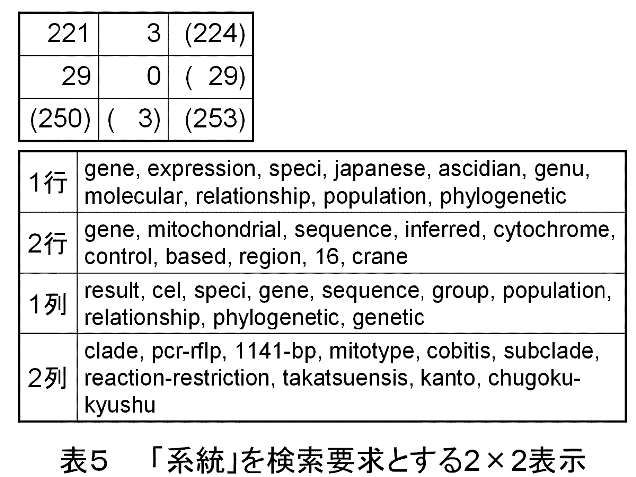 本システムで phylogeny OR phylogenetic を検索要求とし,タイトルと概要で2×2表 示 (クラスタリングは完全リンク法,特徴語抽出方法はコサイン) した結果を表5 (括弧 内の数字は小計を表す.以下同様) に示す.2行2列セルは 0 である (以下,このよう なセルを「空セル」と呼ぶ) から,2行および2列の解釈は容易である.2行の特徴語, すなわちタイトルの特徴語に 16 という数字があり,これは 16S リボゾーム RNA 遺伝子 であることがわかる.この行の特徴語としてミトコンドリア,チトクロムも挙げられてお り,これらのことから生物種の系統を主題とする性粒多様性関連の論文であろうと推定さ れた.実際にこれら 29 論文のタイトルを調べると,種群内でのミトコンドリア遺伝子導 入という極めてユニークな現象に関する論文(DOI:10.2108/zsj.21.795)1報以外は全て生 物種の系統に関する論文であった.一方,2列の特徴語にある clade は系統的に単一の 分岐に帰属される生物群を表す語であり,PCR-RFLP という多様性解析に用いられる手法 とあわせ,このクラスタも生物多様性に関する論文と推測され,また実際その通りであっ た.ここまでで,合計 31 文献が生物種の系統に関する論文であることがわかった.上記 のユニークな論文は分子機能に関するものでもないので,生物多様性,生物機能に加え「 その他」というカテゴリが必要である.