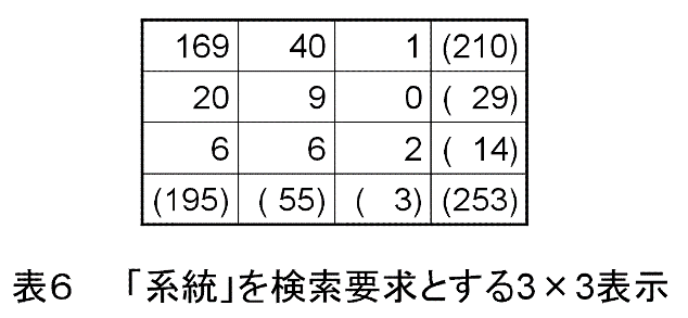 分割数の増加による細粒化について具体的に見ていく.表5で示した2×2表示を3×3 表示に細粒化した結果を表6に示す.表6の小計欄を見ると,1行の 210 と3行の 14 の和が 224 であり,これは表5の1行の小計欄の値と一致するので,表5の1行が表6 の1行と3行に分割されたと判断できる.同様にして表5の1列が表6の1列と2列に分 割されたことが分かる.しかし,このような判断は一般に容易ではなく,特に分割数が多 い場合には困難である.さて,表5の1行1列セルの 221 件が表6で細分されてできた 1行1列,1行2列,3行1列,3行2列の4セルについて分析する.3行1列セルの 6件はすべて生物多様性に関する論文であったが,3行2列セルの 6 件のうち 3 件が生 物多様性に関する論文で,残り 3 件が機能発現に関する論文であった.1行2列の 40 件について詳細に見ると,生物機能に関する論文が 23 件,生物多様性に関するものが 12 件,その他が 5 件であった.さらに細分化していくことはもちろん可能であるが,そ れは必ずしも適当ではない.特に,件数の多いクラスタが頑強な場合は,分割数を増やし てもごく少数あるいは空のセルがいたずらに増えるばかりである.一つの目安としては, セルの半分近くが空セルになった時点で分割数の増加以外の方法を考えるべきである.