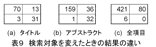 さて,実際に (phylogeny OR phylogenetic) NOT expression で検索すると 194 件の検 索結果が得られる.これらについて分割数を変えたり,ズーミングしたりして調べると, 全てではないがほとんどが生物多様性にかかわる論文であった.また,expression を含 むものについて同様の検索を行うと,生物多様性にかかわる論文は皆無ではないがほとん ど含まれなかった.この事実を踏まえると,phylogeny, phylogenetic, expression の OR 検索を行ったときに,マトリックスで対角的分離が可能なように思われる.実際にタイ トル,アブストラクト,全項目を対象とする2×2表示を調べてみると,それぞれ表9 (a), (b), (c) のようになり,明らかにタイトルを対象とした検索が対角的であることが 分かる.さらに,phylogeny と expression の中間的なクラスタが形成されることを期待 して3×3表示も試みたが,いずれにおいても第三対角成分は 0 であった.このことか ら,分離にはタイトルを対象とする検索が有効であること,phylogeny と expression の 組合せでは中間的な論文はほとんど存在しないことが示唆された.