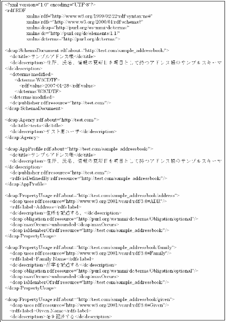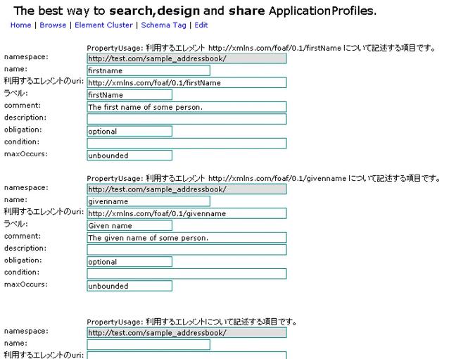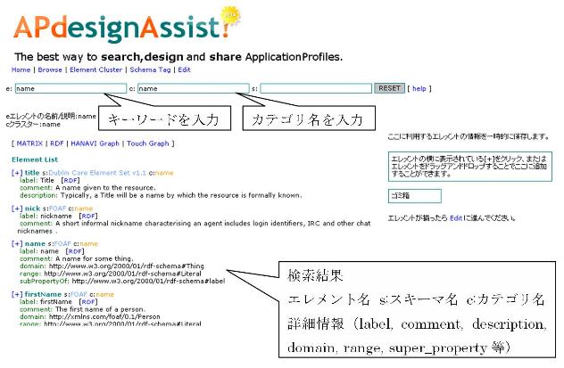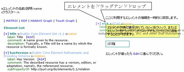 システムを利用したメタデータスキーマ設計は、まずエレメントを検索し、情報の理解 にはグラフ表示を参考にする。要求に一致したエレメントの選択は一時保存領域へのドラ ッグアンドドロップで行い、必要なエレメントがそろった所で必要な項目の入力画面に移 る。図6にエレメントの一時保存画面を示す。必要な項目を入力し、入力を完了すると新 規メタデータスキーマとしてシステムに保存される。保存されたメタデータスキーマは作 成者ごとに管理され、エレメントの追加・編集・削除といった編集作業が可能である。ま た、作成したメタデータスキーマのXML/RDF形式での出力をサポートしている。図7は、 本システムを用いて作成したメタデータスキーマのXML/RDF記述である。