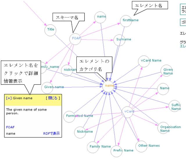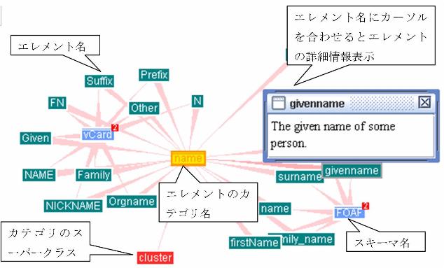 スキーマ情報及び関連するエレメントに対する理解を促す機能としてスキーマ及びエレ メント情報の表示機能に通常のテキスト情報に加え、カテゴリとの対応付けを元にエレメ ントの情報及びスキーマの情報をビジュアル化して表示できる。グラフ表示には、我々の 研究室で作成したシステムHybrid And Network-Assisted Vocabulary Interface(HANAVI)[9]のグラフ表示ライブラリとTouchGraph LinkBrowser[10]を用いた。 図2、3、4ではキーワード「name」+カテゴリ「name」でエレメント情報を検索した 結果をグラフ表示している。図2はHANAVIインタフェースでのグラフ表示、図3は TouchGraphインタフェースでのエレメントとカテゴリのグラフ表示、図4はTouchGraph インタフェースでのスキーマとカテゴリのグラフ表示である。