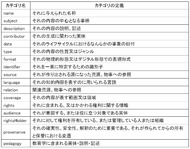表 1 本研究でDublin Coreを参考に作成したエレメントのカテゴリ一覧