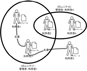 また同じ興味や所属を持つ利用者が集まって,コミュニティという集まりを作ることができる.コミュニティには管理者と呼ばれる利用者がいて,コミュニティに対する各種の運用を行う.