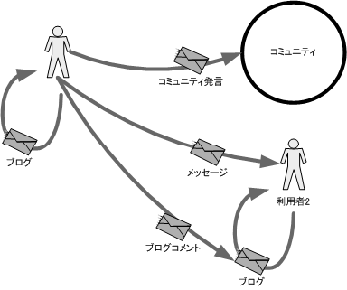 SNSにおいては,利用者は様々な種類の発言をすることができる.それは,自信の日記に相当するブログ,ブログに対するコメント,利用者間でのメッセージ,コミュニティ内での発言といった物である.