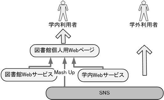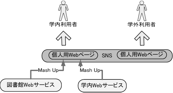 このように 2つのモデルでは種々の違いがあるが,これらは必ずしも排他的ではなく,図書館がSNSをMash Upすることで学内向けの個人用Webページを作り,学外向けには図書館がMash UpされることでSNS上にサービスをすることも可能である.