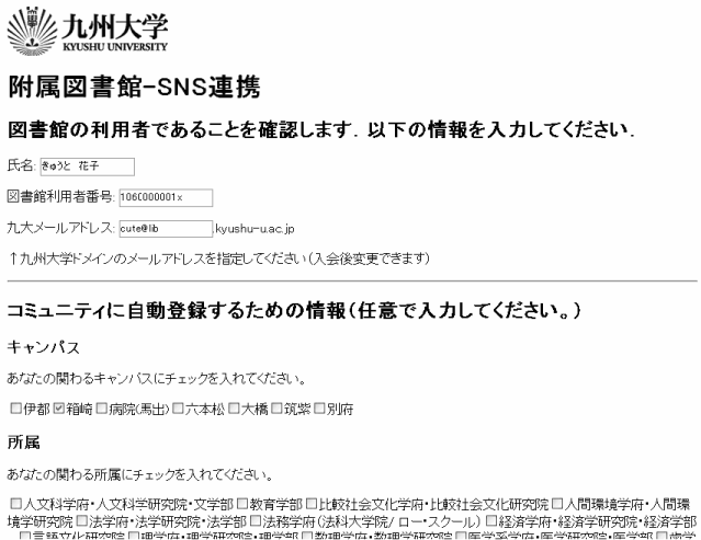 上記の2において,九大所属認証システムは,利用者番号と氏名の組しかチェックしていないため,例えば図書館利用者証を拾った人が不正に登録をできてしまうといった問題は残る.利用者番号は秘密にするよう周知されているため,問題は少ないと考えられる.