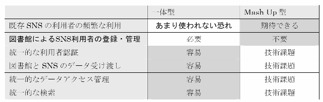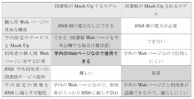 次に,上記の2つのMash Upのモデルを比較したのが 表 2である.図書館がMash Upするモデルでは,個人用Webページを学内に作るので,SNS側の協力なしに自由にページを構成できる上,学内限定のサービスもMash Upすることができる(それを図書館Webページが学外に公開する場合は注意が必要だが).また利用者も学内のWebページとして見えるので安心しやすい.一方で図書館がMash Upされるモデルではこれらが難しいかわりに,学外のSNS利用者への図書館サービスを提供することは,SNSが提供相手の利用者の範囲を広げればいいだけなので容易である.また,利用者にとっては学外のWebページだと認識するので,学内限定の情報をSNSに漏らす恐れは図書館がMash Upするモデルに比べれば少ない.