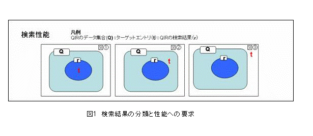 このような,リクエストごとにQIRのデータを検索する方式をとっている論文リンクシステムでは,検索の性能が重要になる. 今回の連携の場合,「研究者情報格納データ15万件に対して,QIRのデータが,約4000件である」という状況から検討したところ,検索の正確性よりも検索漏れをなくすことを重視して構築すべきという結論に達した.図1は検索性能を検証した図である.QIRのデータ集合(Q)に対してターゲットエントリ(T)の元になる研究者情報のデータ量が非常に多いため,検索結果は,図1のケース3が大半になることが分かる. このため,初期の実装においては検索語を「文献タイトル」のように荒く設定することにより,できるだけ漏れのない結果を返すことを意図した.実データに対する分析は5章において行う.