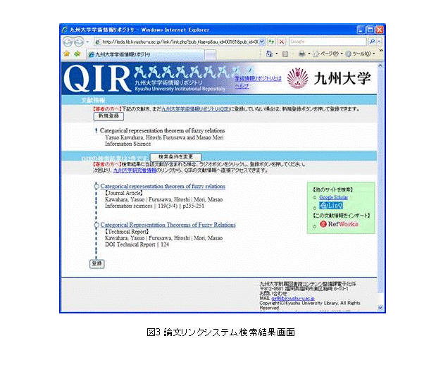 本研究で開発した,研究者情報とQIRを連携するシステムは, 既存システムにほとんど手を加えなかったことで3ヶ月という短い開発期間でシステム間連携が実現し, 開発コストもかなり低く抑えることができている. 研究者情報とQIRのように検索ターゲットとなるデータベースが検索対象のデータベースのデータ量を大きく上回る場合,「検索の正確性より検索漏れの防止を図ることが重要であるが, 運用開始後のデータ解析で, 多数の検索漏れが発生していることが分かった. このことは,当初に設計した検索性能では,不十分であると考えられるため, 利用者に失望感を与えないためにも, 検索パラメータの調整や機能の拡充を行い検索性能の向上させることが今後の課題になっている. 以降では,2章で九州大学QIRと研究者情報の連携の必要性を述べ,3章で要求の分析を行う.4章ではシステムの設計と実装を述べ,5章でデータの解析を行い,6章でまとめる.