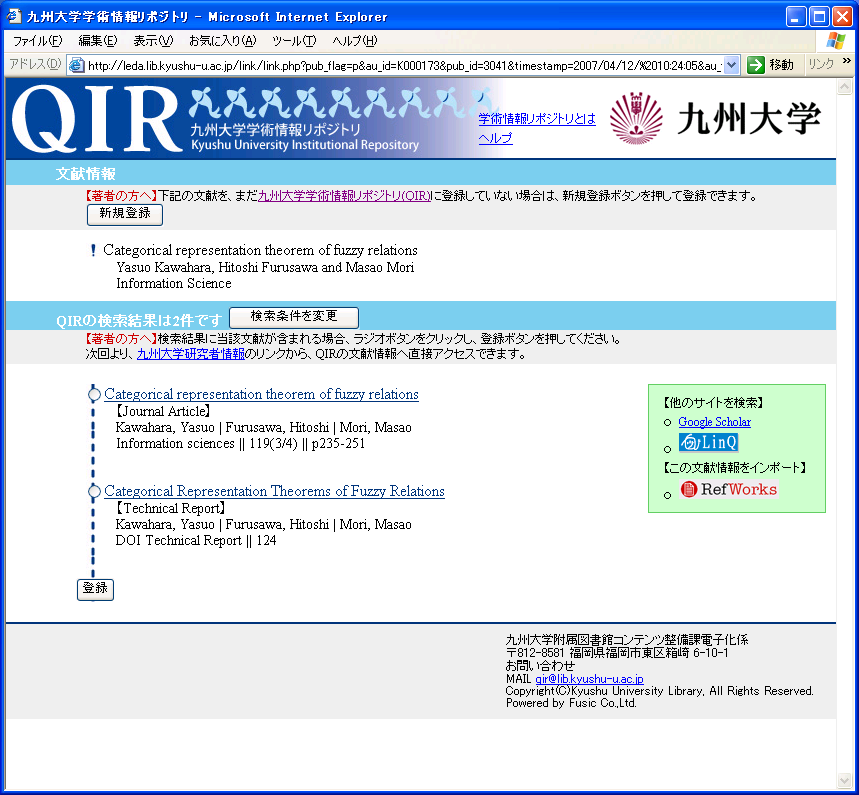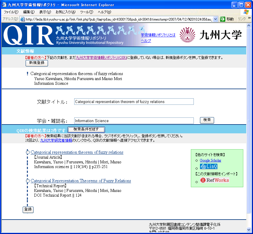 検索結果登録機能は,論文リンク機能で複数の検索結果が表示された後で,検索結果の中から紐付け情報を登録しておく機能である. 具体的には, 論文の著者がQIRの検索結果である複数の候補の中から正しいリンク対象を選択しておく機能で, 紐付けデータ登録後は, 複数の候補を表示することなく, 目的の論文に直接リンクアウトできるようになる. 論文リンクシステムでは,3.1で述べた通り検索漏れをなくすように設計されているため,論文リンクシステムを通して学術情報リポジトリを検索した結果はほとんどの場合,複数の候補が表示されることが考えられるが、検索結果登録機能により、利用者の利便性をより向上させることができるようになる。 研究者情報とQIRの論文を紐付けするためのデータとしては, 研究者情報とQIRのそれぞれの論文ID及び研究者情報のレコードのタイムスタンプをデータベースに格納している。