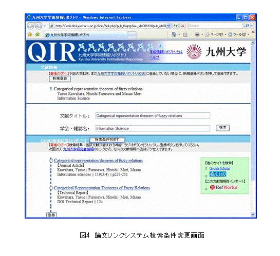 図3の画面上段では,研究者情報からURLパラメータとして送られてきた検索条件を表示しており,画面下段では,論文リンク機能の検索結果を表示している. 図3の例では2件の論文がヒットしている. 図3の画面中央の「検索条件を変更」ボタンをクリックすると検索条件を変更する入力フォームが表示され(図4),研究者情報からのリンクアウトだけでなく,手動でも検索結果を導き出せるようになっている. 文献の著者が,図3の画面でヒットした複数の候補の中から正しい文献を選択し,タイトル横のチェックボックスにチェックを入れると,論文リンクシステムの検索結果登録機能が呼び出され,研究者情報とQIRの紐付け用のデータが登録される. 紐付けデータが登録されると,次回からは検索結果画面(図3)を経由することなく直接QIRの該当文献にリンクするようになる. 図3の画面で検索結果の候補に該当の文献が存在しなかった場合は,検索条件を引き継いでGoogleShoclar[10]やリンクリゾルバを利用した学術情報リンクサービスであるきゅうとLinQ[11]で検索できるようになっている.