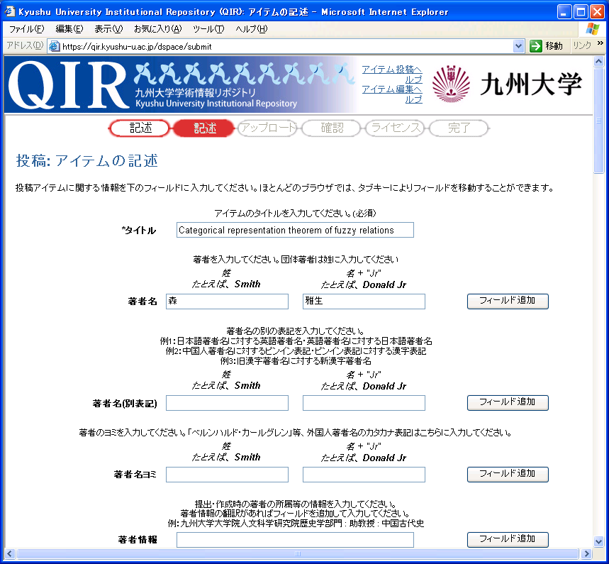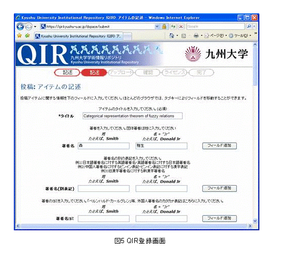 また,文献の著者であれば,図3の「新規登録」ボタンをクリックすることで,QIRへ文献を登録する画面にログインすることができる. このとき,論文リンクシステムでは,論文登録機能が呼び出されるため,図5の通り研究者情報から送られてきた文献情報をもとに,QIRの入力フォームの各項目があらかじめ入力された画面が表示される. なお,検索結果登録および文献登録の際のシステムへのログインに使用される認証機能や,論文登録機能は,QIR(DSpace)の機能を使用しているため,論文リンクシステムへのログイン後の画面操作は,すべてQIRに直接ログインした場合と同様の操作となっている.
