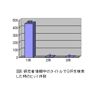 図6は,研究者情報中のタイトルでQIRを検索したときのヒット件数の分布である.この図から,1件ヒットするのは455個ある.また2件ヒットするのは3個,3件以上は0個と少ない.このことから,タイトルのみを入力した検索でさえも,QIRの件数が研究者情報の件数より現時点で少ないことを考慮しても,検索結果が0件の場合が多いことがわかる.情報が存在するにもかかわらず漏れているのか,情報が存在しないことによるのかはわからないが,少なくともユーザにとっては検索結果が0件なのは余計な失望感を与える可能性があるため,あいまい検索などの工夫により件数を上げる工夫が必要であろう.