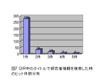 図7は,逆にQIR中のタイトルで研究者情報を検索したときのヒット件数の分布である.図6と比べて,2件以上ヒットすることが比較的多いことがわかる.これは,研究者情報からリンクアウトされるQIRの文献が,実はほかの研究者の情報からもリンクアウトされるべきであることを意味していると考えられる.たとえばある研究者が紐付けをしたら,その文献を共著するほかの研究者からも紐付けをするといった,複数の研究者にまたがる機能の有用性を示唆している.