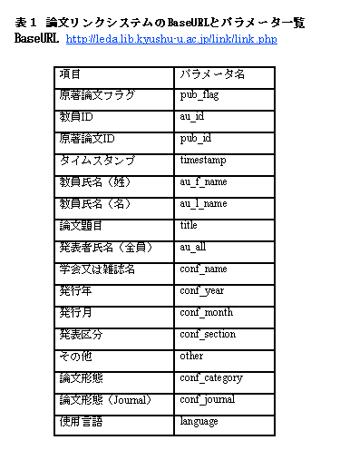 以上が,論文リンクシステムの機能である. なお,論文リンクシステムでは,各機能で使用するデータをRDBMS(リレーショナルデータベース管理システム)で管理している. 表1は,論文リンクシステムのBaseURLと原著論文のパラメータ仕様である.参考までに紹介しておく.