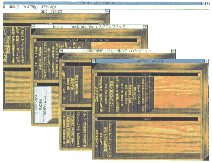 第二の「個人化」の具体化機能は入手した情報の編集機能である.ソフ トウェアKnowledge Scrapbookを開発して,入手した情報の一部を切り 取って自分のスクラップブックに仮想的に切り張りすることを可能とした (図6).切り張りした情報は先述したように情報の所在を示すポインタ によって記録し,コンテンツは取り込まない.このスクラップブックはテ キストを挿入して自由に編集することができる.スクラップブックを開く と,システムはポインタから自動的に原情報にアクセスして該当部分を抽 出して,あたかもそこに情報があるかのように表示する.また,スクラッ プブックの出典情報を示す部分をクリックすると,元の全文情報を表示さ せることができる.