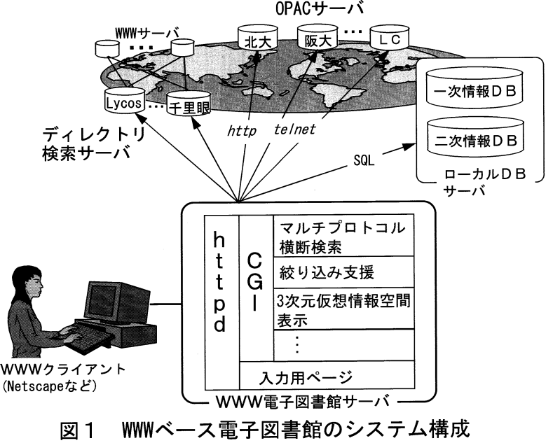 CERN HTTPD を起動するWWW電子図書館サーバと、ローカルな情報を蓄積するた めのローカルデータベースサーバで構成され、両者はTCP/IPベースのLANにより接 続されている。WWW電子図書館サーバはインタネットに接続され、国内外のOPACサ ーバやディレクトリ検索サーバにアクセスすることができ、また、WWWクライアン トからWWW電子図書館サーバをアクセスすることができる。データベースサーバで は、書誌事項などの二次情報はOracle RDBで管理し、一次情報はファイル形式で 保持している。