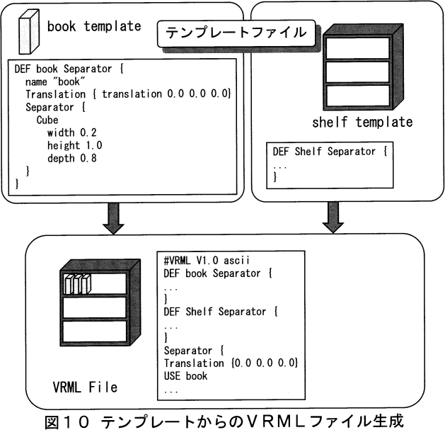 VRMLファイルは表示するデータの位置や大きさ、大きさなどの属性が各オブジ ェクトに対して階層的に記述できる。本システムでは本棚や本の基本的形状につ いては、あらかじめ3次元CADツール等で作成する。作成した形状は形状全体の 位置、大きさ、および色に関しては変更可能なパラメータとし、テンプレート としてデータベースに蓄積する。