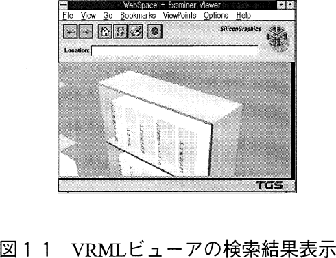 本システムでは、VRMLを用いて検索結果を3次元の形状として視覚化すること によって、従来のデータベース検索でテキストとして一覧形式で表示する場合 に比較して、データ量を直観的に把握できるなどの効果が期待できる。