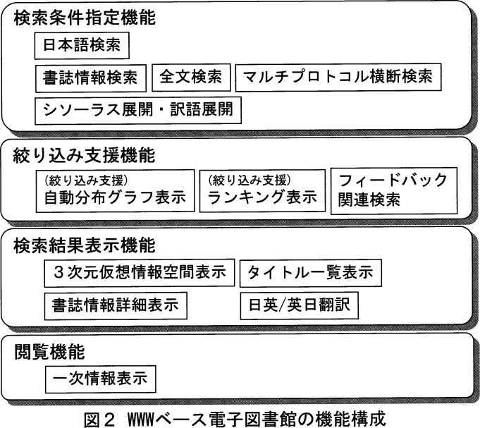 電子図書館システムは、コンピュータ操作知識、検索に関する知識、利用目的、 検索要求の明確さ、応答時間や網羅性といった検索実行への要求などの点で、幅 広い層の利用者が利用できるようなインタフェースやサービス機能を提供する必 要がある。