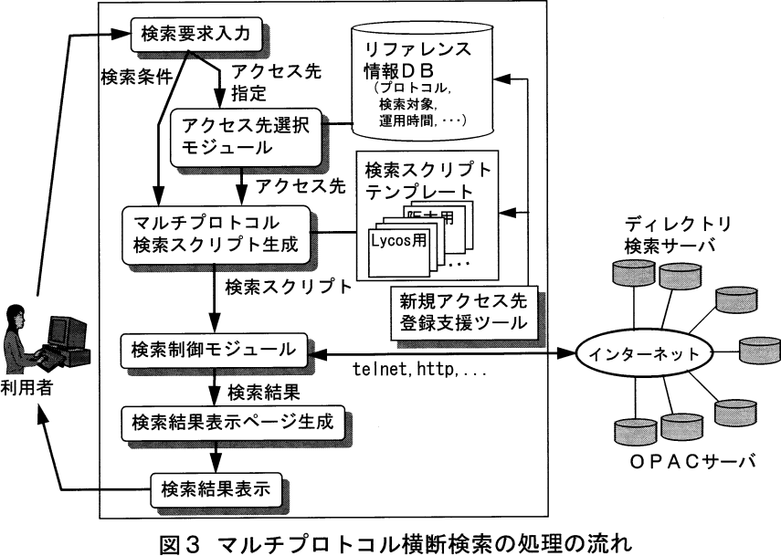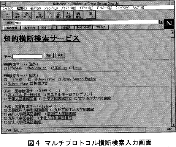 インターネットでアクセス可能な複数の機関のOPACシステムやデ ィレクトリ検索システムをWWWブラウザから同一手順でシームレス に検索できる機能である。