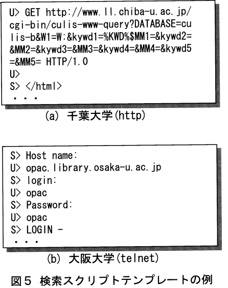 図5に検索スクリプトのテンプレートの例を示す。例中で "U>"で始まる行は利 用者側のWWWサーバから検索先のサーバに送られるメッセージの内容を示し、"S> "で始まる行は、検索先のサーバから送られてくるメッセージ(の一部)を示す。