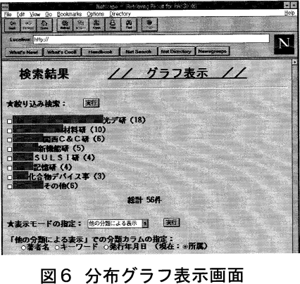 グラフ項目の表示順序については、キーワード、著者名、所属名の場合にはグ ループ化してカウントした件数が多い項目順に並べ、画面の大きさとの兼ね合い から7つまでを区別して、残りは「その他」でひとまとめにして表示する。発行年 月日の場合には、件数に関わらず、古いもの順に全ての項目を表示する。