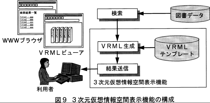 VRMLを用いた3次元仮想書架の生成により検索結果の直感的な把握、容易 な閲覧を可能にする。